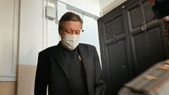 Актёр Михаил Ефремов отправился на очередное заседание по уголовному делу о ДТП со смертельным исходом, которое пройдёт в Пресненском суде Москвы. Из своей квартиры он вышел в медицинской маске, закрыл дверь на этаже и стал спускаться по лестнице.